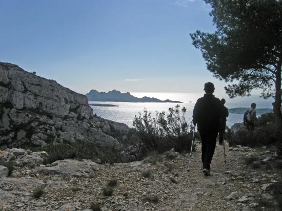 Marseille, c'est toute ma jeunesse et en habitant Impasse Emile sur les hauteurs du quartier de la Vieille-Chapelle, j'ai toujours eu devant les yeux, sa splendide baie mais j’avais aussi, depuis ma terrasse, devant moi et légèrement sur ma gauche, les jolies collines blanchâtres et calcaires du Massif de Marseilleveyre. Mais je l'avoue, il a fallu que je sois adulte pour prendre conscience de toutes les beautés que recelait ce massif. Pourtant, dieu sait si j’ai fréquenté Marseilleveyre et le Roy d’Espagne bien avant qu’on y construise toutes ces barres d’immeubles qui ont défiguré les paysages de mes souvenirs d'enfance. Pour moi, comme pour tous les minots des quartiers sud, ces coins-là étaient nos terrains de jeux préférés. Dans les pinèdes de ce massif, nous construisions des cabanes de branchages et jouions aux cow-boys et aux indiens ou bien à cache-cache, nous dévalions et faisons des roulés-boulés sur les pentes de la Sablière, dans le canal d’irrigation, nous faisions des courses de bateaux à l’aide de petits canots taillés dans les écorces des pins, dans ses collines, nous partions sur les chemins pour d’infernales courses de vélos, prémices du VTT et du vélocross, qu’à notre manière, nous commencions à inventer, nous allions jouer au foot dans les prés de verdure de la campagne Pastré, j’en passe et des meilleurs…. Cet espace déjà si vaste pour nos petites jambes suffisait à notre bonheur et nous n’allions guère plus loin. Pourtant ce plus loin existait déjà à travers tous ces nombreux sentiers qui jalonnent ce beau massif. Ces sentiers qu'un pastoralisme toujours très présent avait su créer depuis la nuit des temps. Aujourd’hui, je vous propose d'aller marcher sur un de ces sentiers, pour une randonnée que j’ai intitulée « Balcon sur le Grand Malvallon et le vallon de la Mounine » mais que j’aurais pu appeler « Balcon sur l’Archipel de Riou » tant notre regard est en permanence attiré par cette mer ô combien si bleue. Car ici à Marseille, comme le chante si bien le Massilia Sound System « mais quelle est bleue ! » notre chère Méditerranée dont je connais personnellement, presque aussi bien ses fonds marins que sa surface ! D’ailleurs sur cette randonnée qui démarre tout au bout de la rue Parangon, trois couleurs prédomineront tout au long du parcours car outre le bleu de la mer et du ciel, on ne voit que le blanc de la ville et du massif calcaire et le vert de la végétation. Le ciel étant très gris ce jour-là, ce n’est pas dans cette trilogie de couleurs que nous avons démarré cette balade sur le chemin bitumé qui s’élève derrière la dernière barre d’immeubles, juste au dessus de la Campagne Pastré. Heureusement, le mistral est bien présent et pousse vers le midi les « désagréables » gros nuages chargés de pluie. Quand le bitume s’arrête, on prend à droite un petit sentier balisé en jaune qui s’élève au milieu des pins, des chênes kermès, des bruyères et des romarins en fleurs en direction d’une ancienne tour de guet que l’on va laisser sur la droite au franchissement d’un vieux muret fracturé. Ce balisage jaune, et malgré un premier carrefour de chemins (chiffre 5, couleurs rouge, noir, vert et jaune), juste après une petite pinède que l’on traverse, on va le suivre jusqu’au Col de la Selle. Depuis très longtemps déjà, de magnifiques panoramas se sont dévoilés à nos regards : sur Marseille, sa Vierge de la Garde, ses massifs de collines qui l’entourent, sa anse, ses îles de l’archipel du Frioul, ses plages, etc.… Devant nous, le sommet de Marseilleveyre dresse son impressionnante silhouette minérale et pyramidale et à nos pieds, on aperçoit le Mont Rose, le port de plaisance de la Pointe Rouge et le joli domaine Pastré avec son épaisse forêt et son splendide château aux façades de briques roses. Au Pas de la Selle (275 m), la vue bascule vers le sud, sur les îles de l’Archipel de Riou et sur l'infini de la mer. Après cette modeste montée quasi ininterrompue, le sentier redescend dans un sentier de graviers et d’éboulis puis il reste suspendu en balcon dans un décor rocailleux à souhait. Ici, devant ce cirque des Trois Arches que domine le plateau de l’Homme Mort et au dessus de ce ravin crevassé du Grand Malvallon, on prend conscience de ce que la nature a été capable de créer au fil des millénaires. Les cataclysmes successifs, l’érosion, les eaux des rivières et de la mer ont façonné des paysages karstiques déchiquetés à nul autre pareil. C’est dans ce cadre grandiose et dominé sans cesse par les hautes falaises blanches du massif que l’on déambule en direction de Callelongue, point terminal de cette randonnée. De temps à autre, et notamment aux petites intersections, il faut prêter attention au balisage et mentions peintes à même les roches. Nous, on continue à suivre le balisage jaune bien présent. Toutes les îles de l’archipel apparaissent dont la plus grande Riou, telle un immense bâtiment de guerre escorté de ses petits navires de protection que sont les îles de Plane, Jarre, de Jarron et les minuscules îlots des Congloué et des Empereurs. Au col de la Galinette (149 m), on délaisse le balcon du Grand Malvallon pour celui du vallon de la Mounine. On descend dans un petit vallon d’éboulis, on passe devant une grotte puis le chemin domine la calanque dite de la Mounine. La petite anse a été vulgairement dénommée ainsi car, par sa forme et son étroitesse, elle a sans doute du rappeler le sexe féminin à ceux qui lui on donnait ce nom provençal tiré du mot « moùno » signifiant « chatte ». Mais de notre balcon et même si on se rapproche un peu plus du rivage, cette ressemblance n’est pas très évidente même avec beaucoup d’imagination. A l’approche de Callelongue, le sentier bifurque légèrement vers l’ouest où l’on aperçoit le séma